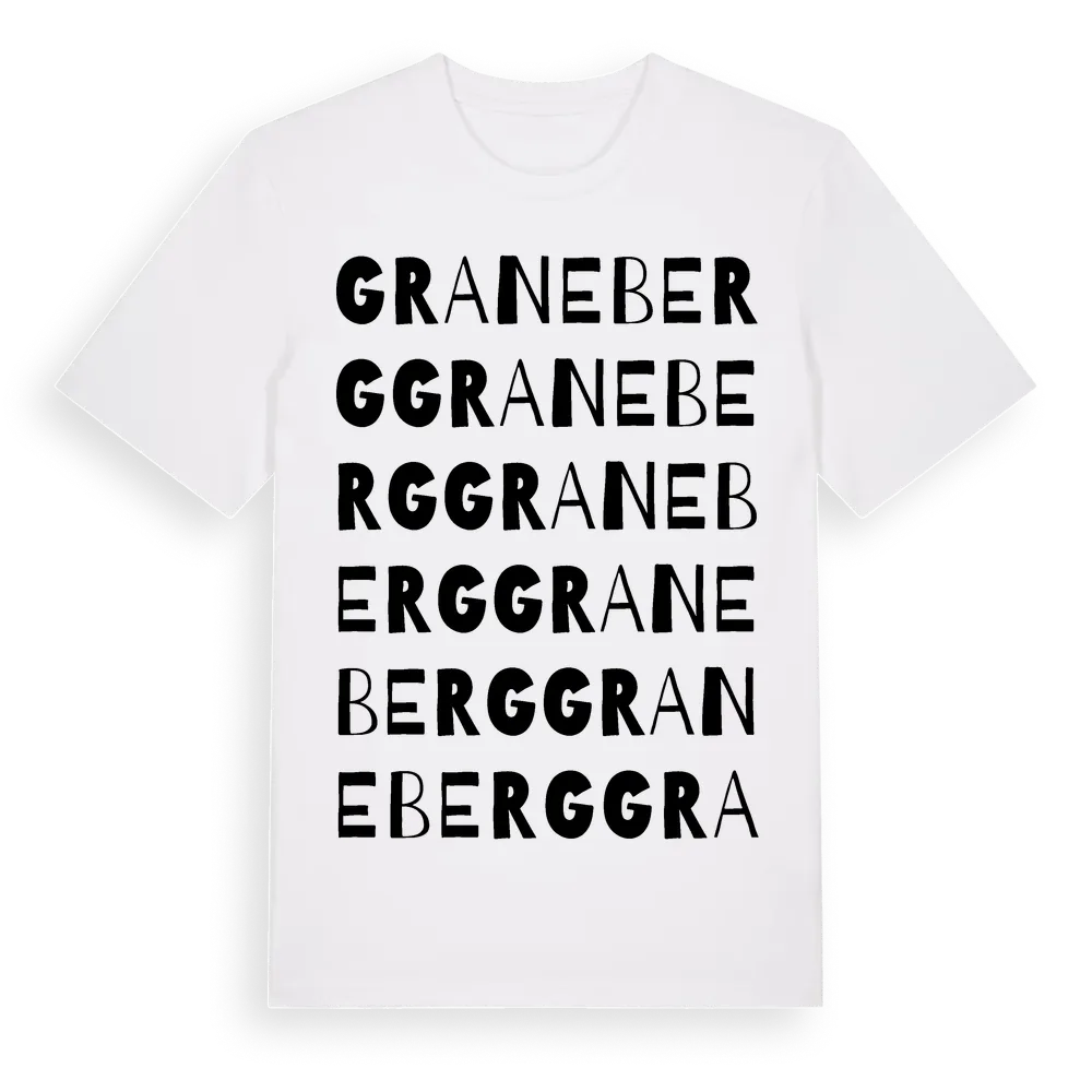 Graneberg ordlek t-shirt är inspirerad av Graneberg i Skåne län, Sverige. Tröjan är designad för dig som har en speciell koppling till platsen – oavsett om du bor här, har rötterna här eller bara älskar Graneberg.