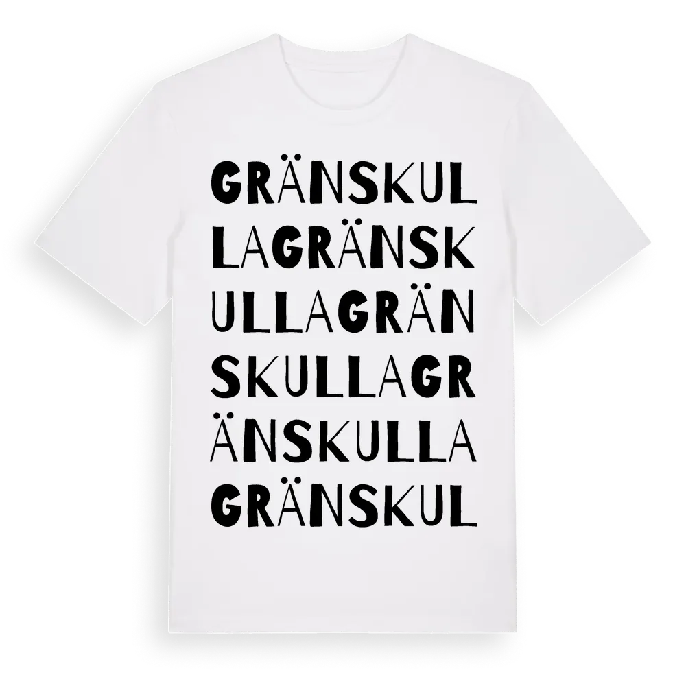 Gränskulla ordlek t-shirt är inspirerad av Gränskulla i Skåne län, Sverige. Tröjan är designad för dig som har en speciell koppling till platsen – oavsett om du bor här, har rötterna här eller bara älskar Gränskulla.