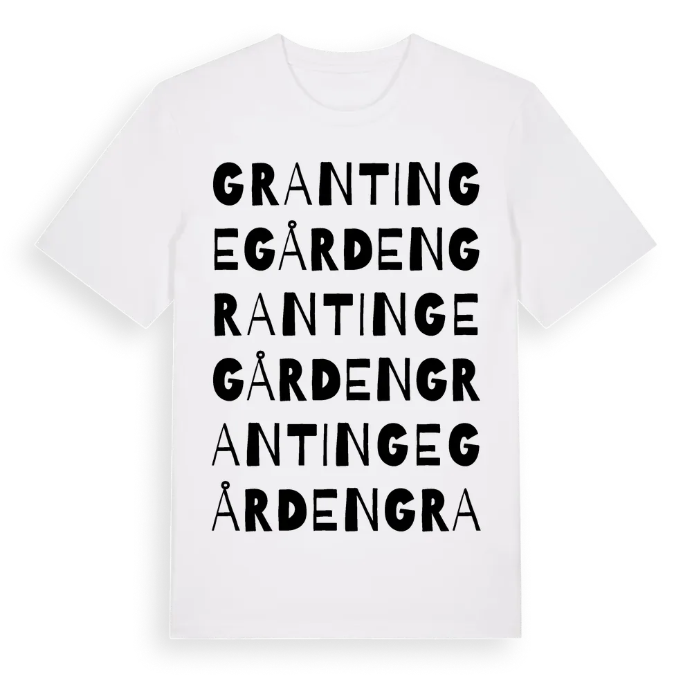 Grantingegården ordlek t-shirt är inspirerad av Grantingegården i Skåne län, Sverige. Tröjan är designad för dig som har en speciell koppling till platsen – oavsett om du bor här, har rötterna här eller bara älskar Grantingegården.