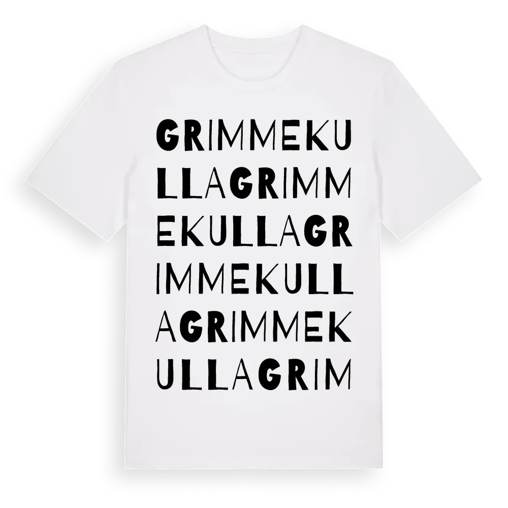 Grimmekulla ordlek t-shirt är inspirerad av Grimmekulla i Skåne län, Sverige. Tröjan är designad för dig som har en speciell koppling till platsen – oavsett om du bor här, har rötterna här eller bara älskar Grimmekulla.