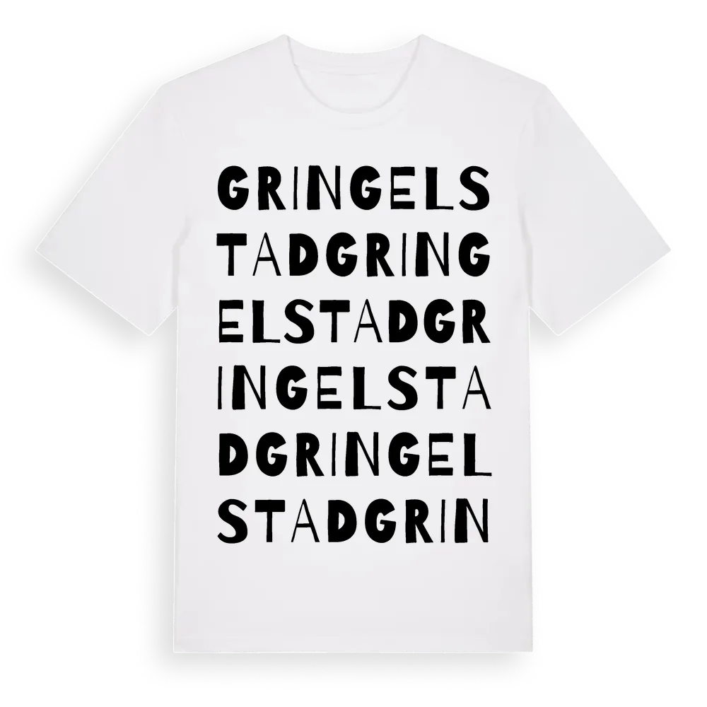 Gringelstad ordlek t-shirt är inspirerad av byn Gringelstad i Skåne län, Sverige. Tröjan är designad för dig som har en speciell koppling till platsen – oavsett om du bor här, har rötterna här eller bara älskar Gringelstad.