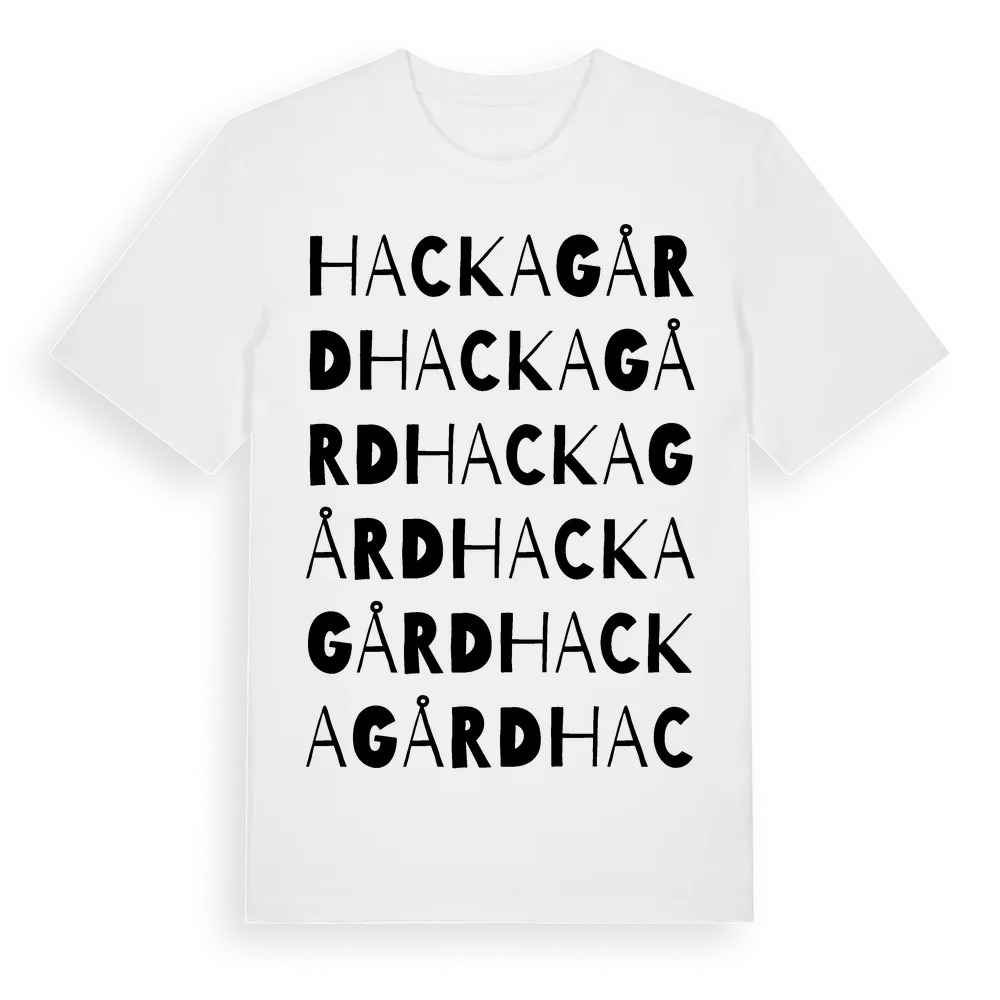 Hackagård ordlek t-shirt är inspirerad av byn Hackagård i Skåne län, Sverige. Tröjan är designad för dig som har en speciell koppling till platsen – oavsett om du bor här, har rötterna här eller bara älskar Hackagård.