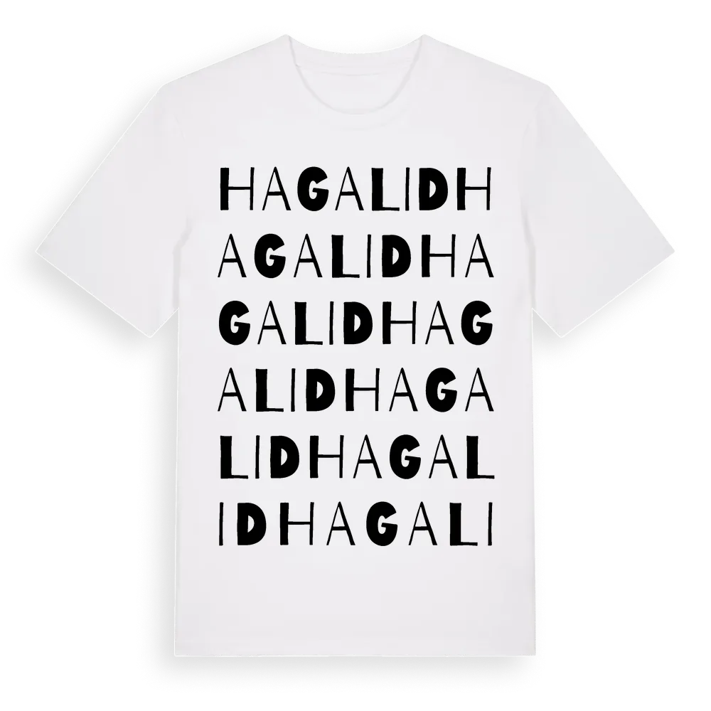 Hagalid ordlek t-shirt är inspirerad av Hagalid i Skåne län, Sverige. Tröjan är designad för dig som har en speciell koppling till platsen – oavsett om du bor här, har rötterna här eller bara älskar Hagalid.