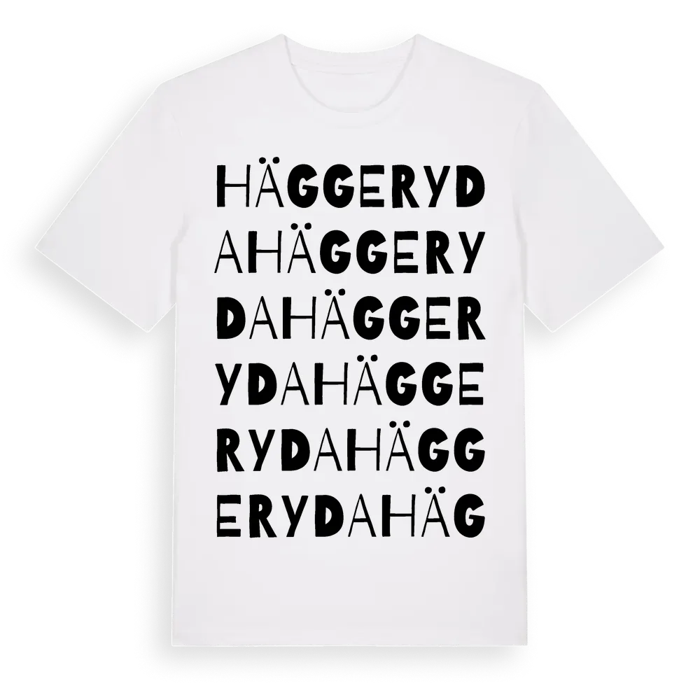 Häggeryda ordlek t-shirt är inspirerad av byn Häggeryda i Skåne län, Sverige. Tröjan är designad för dig som har en speciell koppling till platsen – oavsett om du bor här, har rötterna här eller bara älskar Häggeryda.