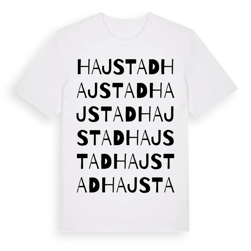 Hajstad ordlek t-shirt är inspirerad av Hajstad i Skåne län, Sverige. Tröjan är designad för dig som har en speciell koppling till platsen – oavsett om du bor här, har rötterna här eller bara älskar Hajstad.