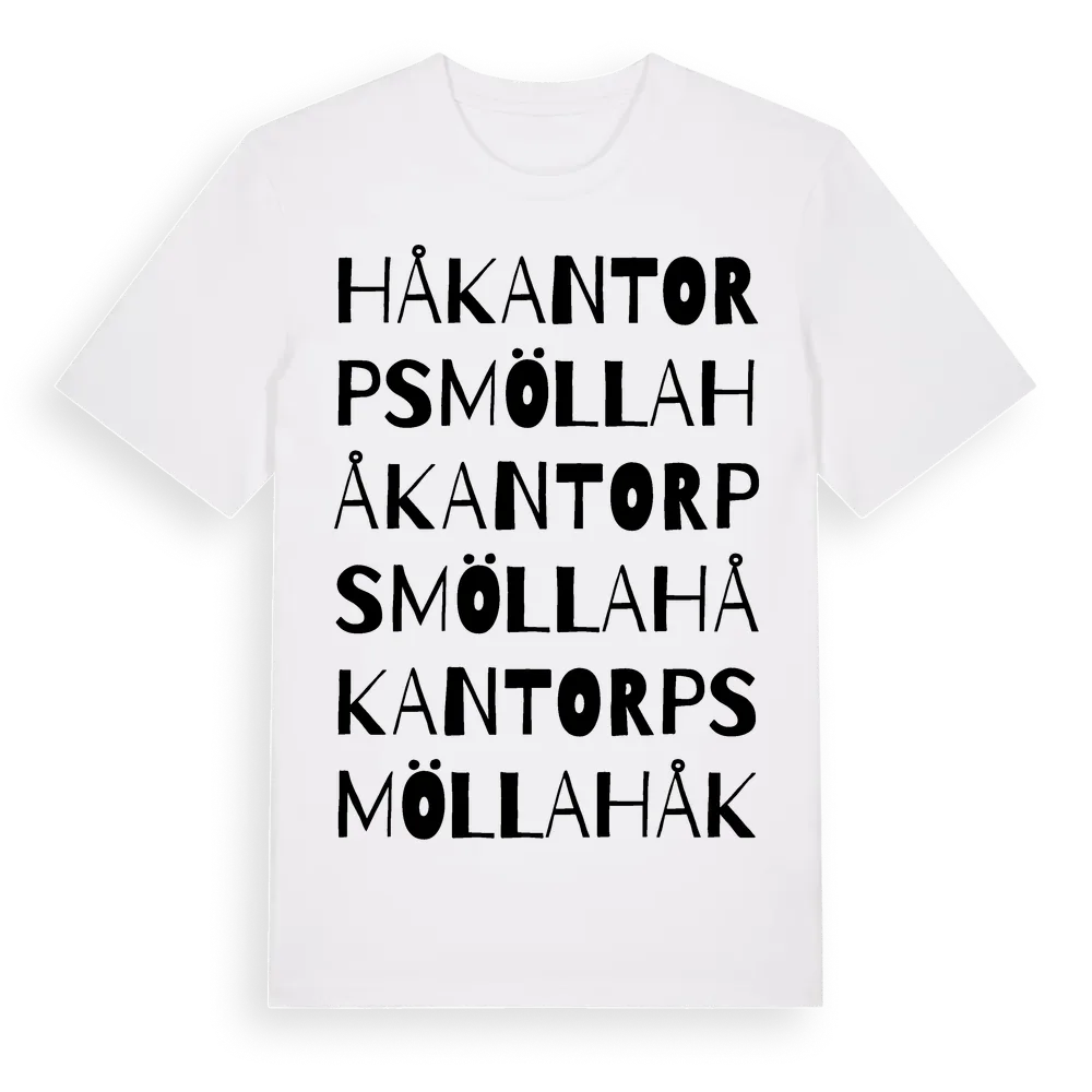 Håkantorpsmölla ordlek t-shirt är inspirerad av Håkantorpsmölla i Skåne län, Sverige. Tröjan är designad för dig som har en speciell koppling till platsen – oavsett om du bor här, har rötterna här eller bara älskar Håkantorpsmölla.