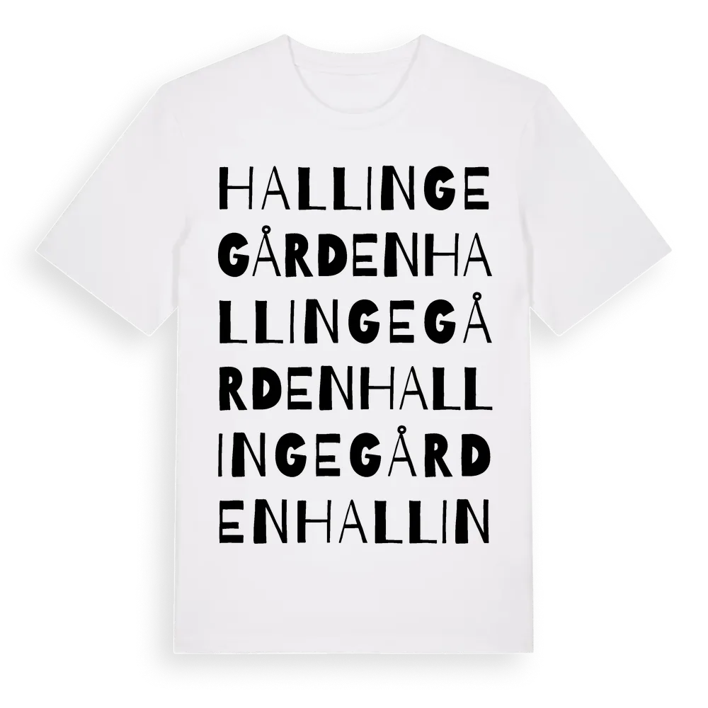 Hallingegården ordlek t-shirt är inspirerad av Hallingegården i Skåne län, Sverige. Tröjan är designad för dig som har en speciell koppling till platsen – oavsett om du bor här, har rötterna här eller bara älskar Hallingegården.