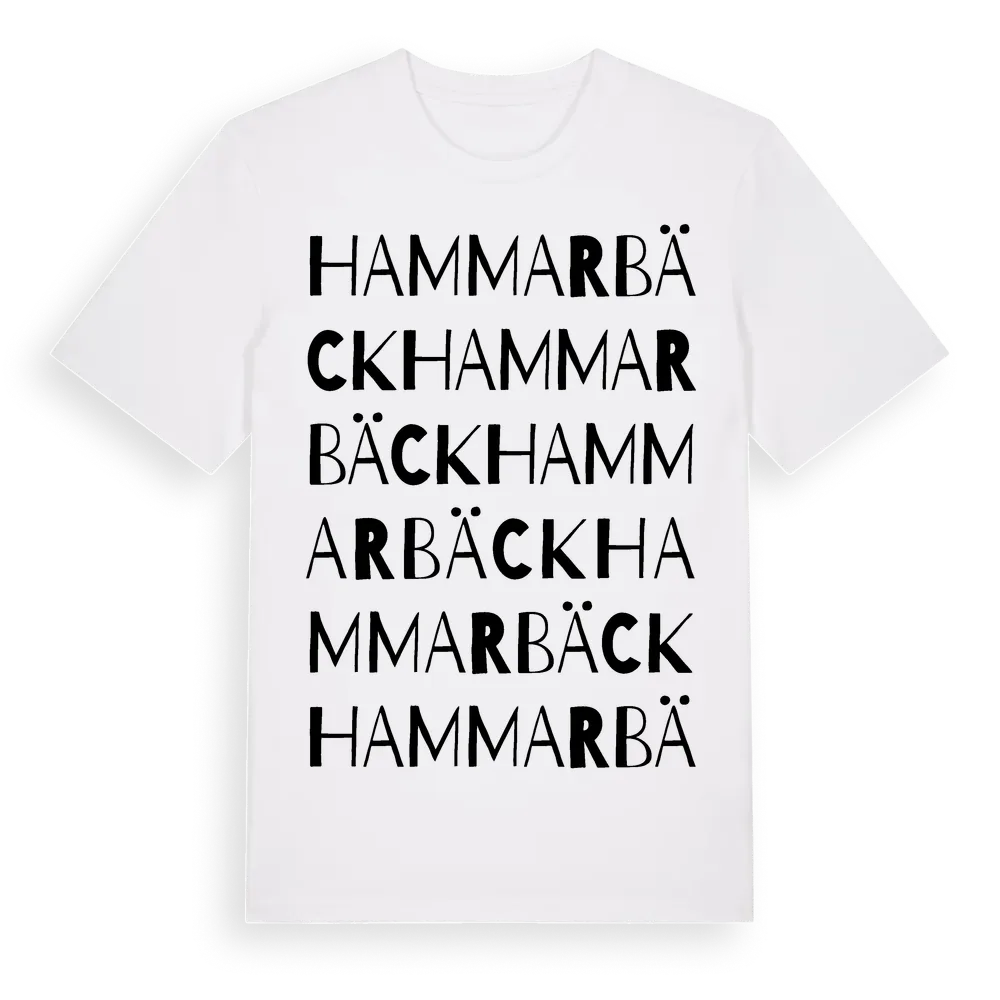 Hammarbäck ordlek t-shirt är inspirerad av Hammarbäck i Skåne län, Sverige. Tröjan är designad för dig som har en speciell koppling till platsen – oavsett om du bor här, har rötterna här eller bara älskar Hammarbäck.