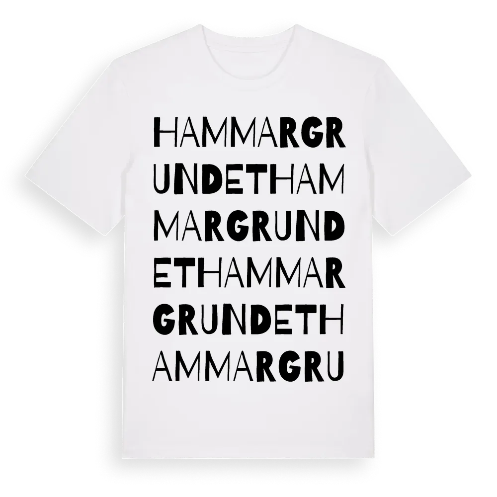 Hammargrundet ordlek t-shirt är inspirerad av Hammargrundet i Skåne län, Sverige. Tröjan är designad för dig som har en speciell koppling till platsen – oavsett om du bor här, har rötterna här eller bara älskar Hammargrundet.