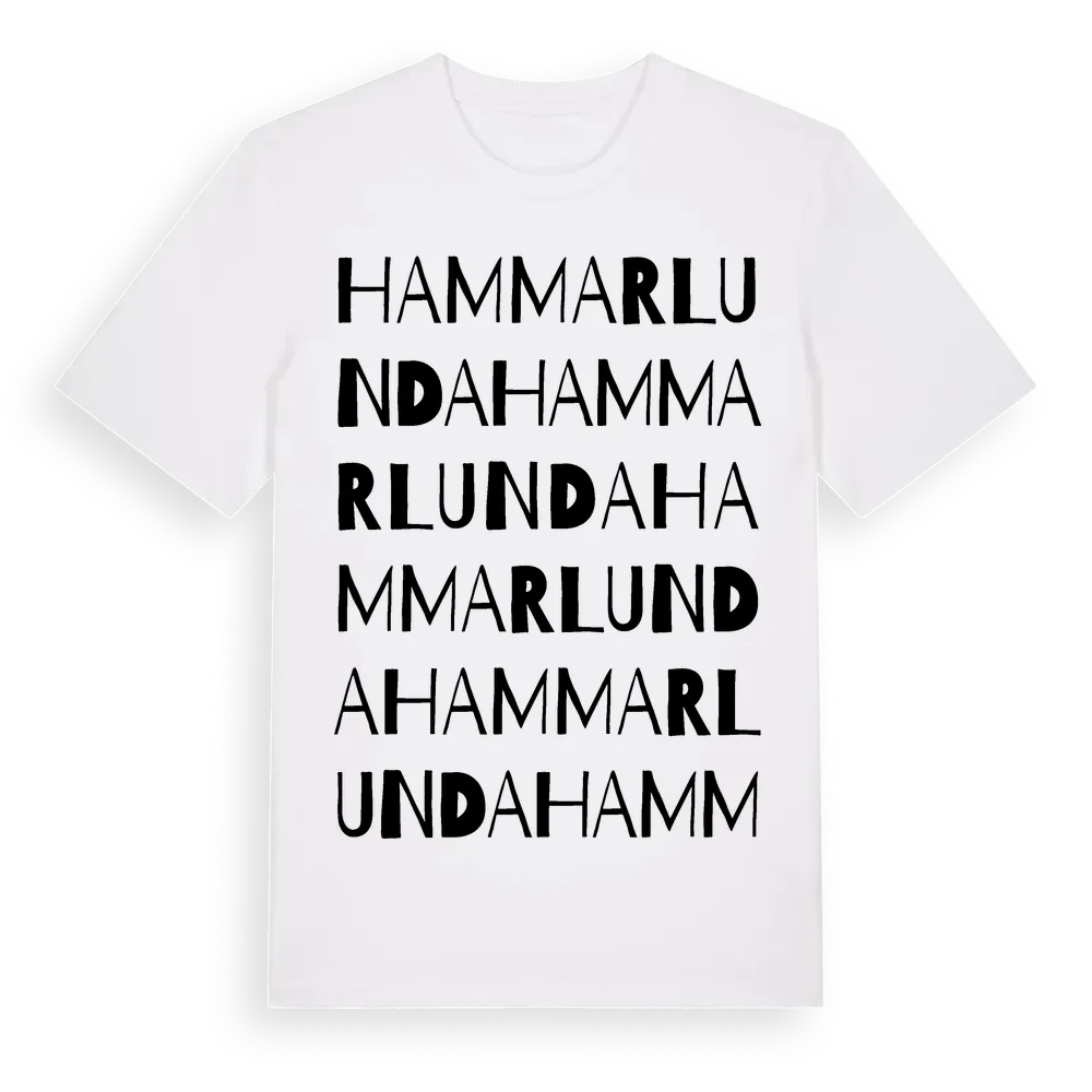 En ordlek byggd på Hammarlundas namn. Subtilt och klurig – ett motiv som bara de som verkligen känner platsen fullt ut förstår. Premium bomull, unisex – från Hammarlunda i Skåne län.