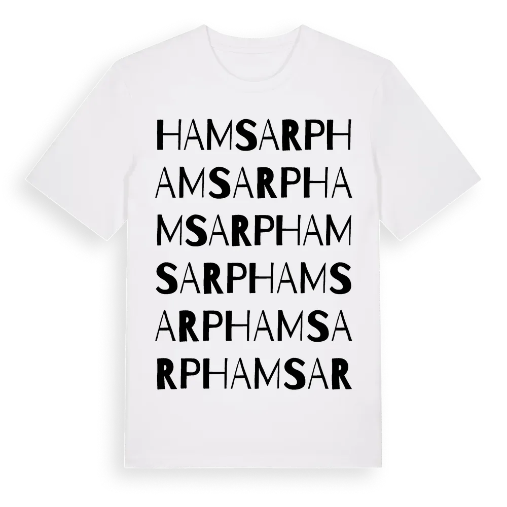 Hamsarp ordlek t-shirt är inspirerad av byn Hamsarp i Skåne län, Sverige. Tröjan är designad för dig som har en speciell koppling till platsen – oavsett om du bor här, har rötterna här eller bara älskar Hamsarp.