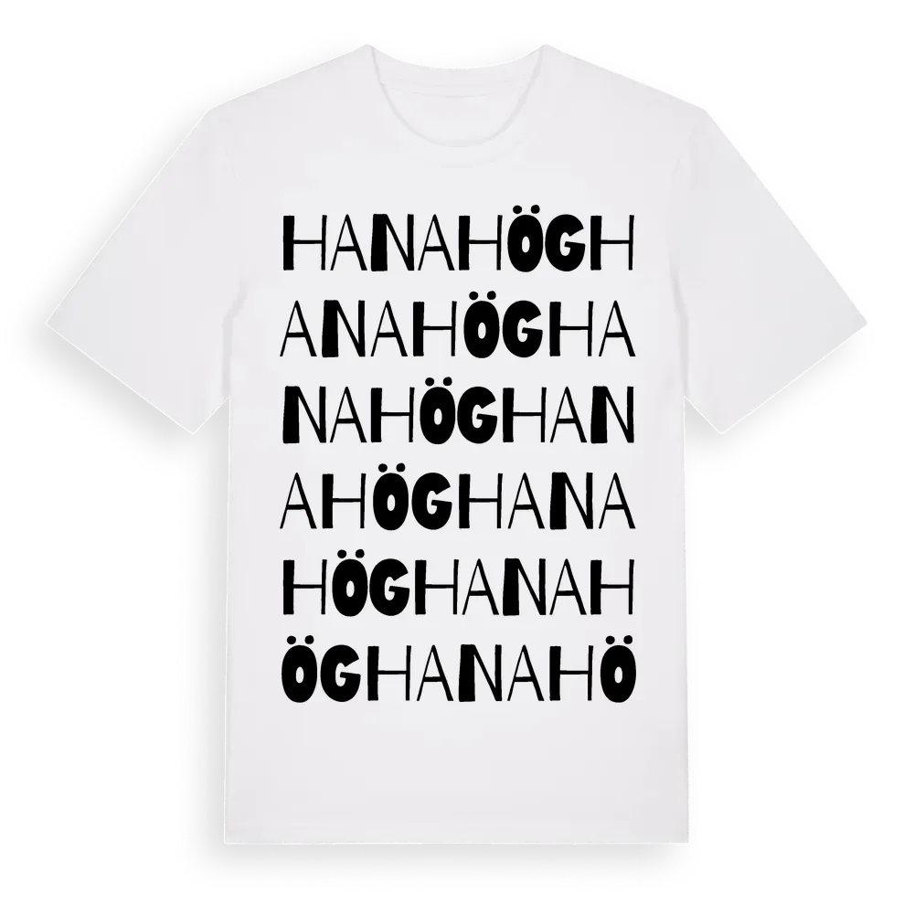 Hanahög ordlek t-shirt är inspirerad av byn Hanahög i Skåne län, Sverige. Tröjan är designad för dig som har en speciell koppling till platsen – oavsett om du bor här, har rötterna här eller bara älskar Hanahög.
