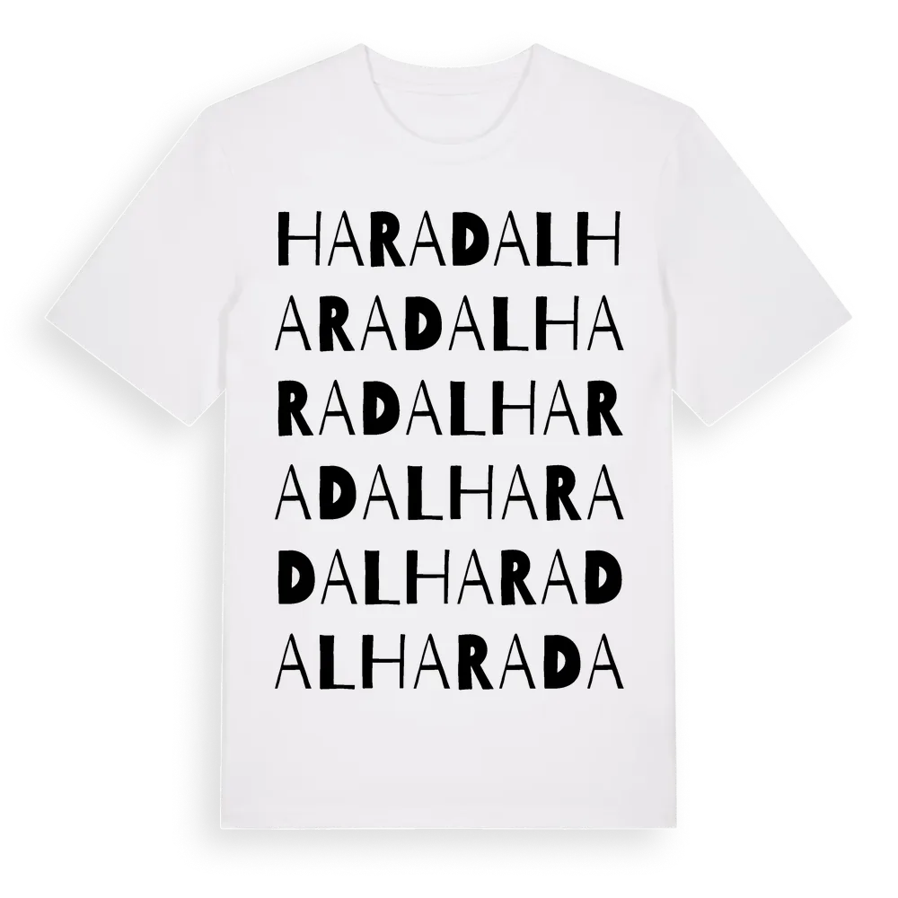 Haradal ordlek t-shirt är inspirerad av stadsdelen Haradal i Skåne län, Sverige. Tröjan är designad för dig som har en speciell koppling till platsen – oavsett om du bor här, har rötterna här eller bara älskar Haradal.