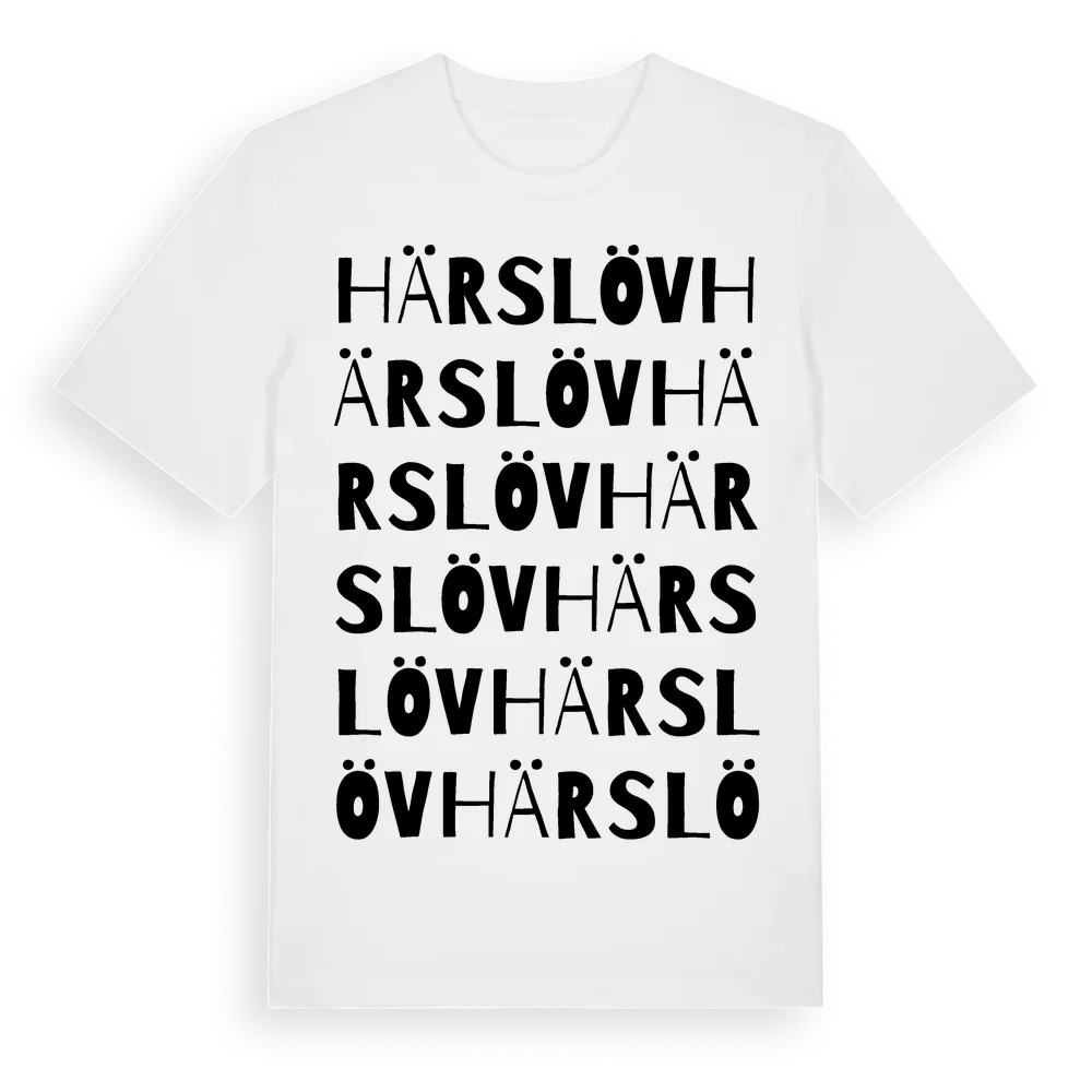 Härslöv ordlek t-shirt är inspirerad av byn Härslöv i Skåne län, Sverige. Tröjan är designad för dig som har en speciell koppling till platsen – oavsett om du bor här, har rötterna här eller bara älskar Härslöv.