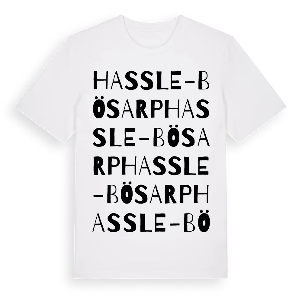 En ordlek byggd på Hassle-Bösarps namn. Subtilt och klurig – ett motiv som bara de som verkligen känner platsen fullt ut förstår. Premium bomull, unisex – från byn Hassle-Bösarp i Skåne län.