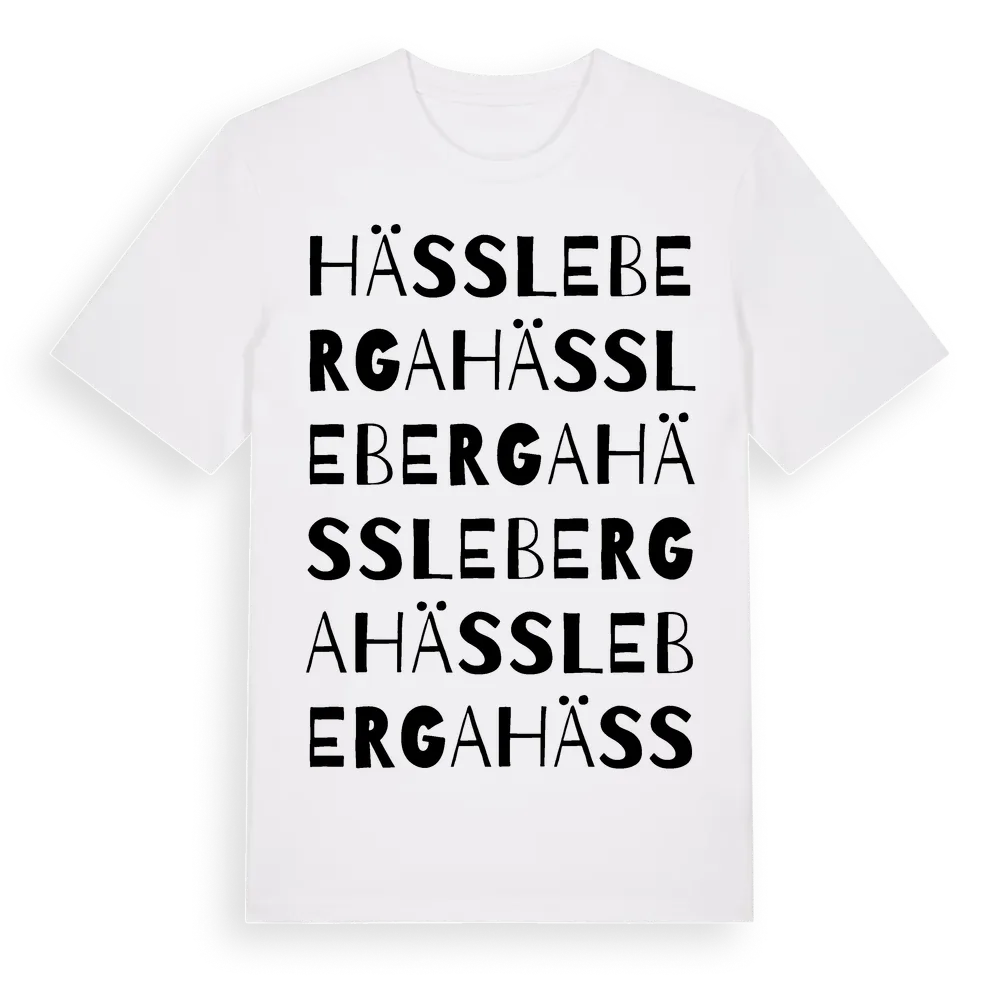 Hässleberga ordlek t-shirt är inspirerad av byn Hässleberga i Skåne län, Sverige. Tröjan är designad för dig som har en speciell koppling till platsen – oavsett om du bor här, har rötterna här eller bara älskar Hässleberga.