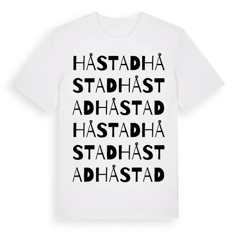 Håstad ordlek t-shirt är inspirerad av byn Håstad i Skåne län, Sverige. Tröjan är designad för dig som har en speciell koppling till platsen – oavsett om du bor här, har rötterna här eller bara älskar Håstad.