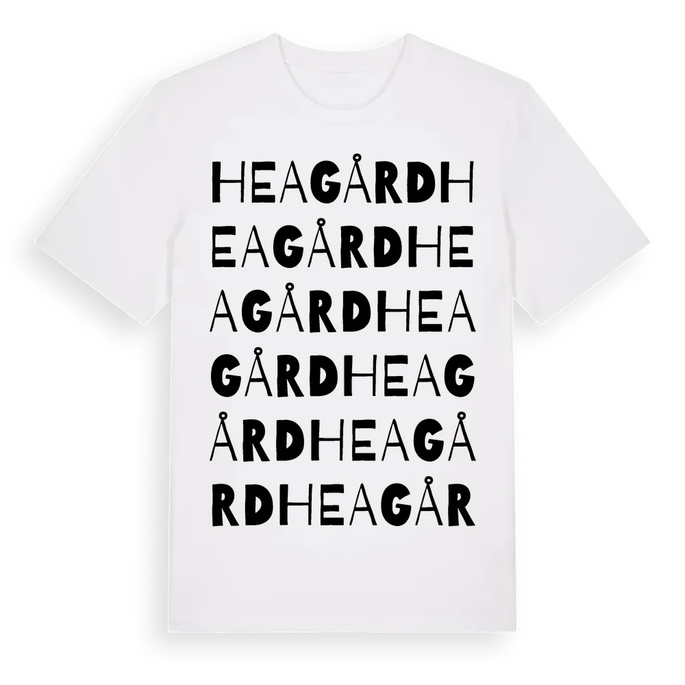 Heagård ordlek t-shirt är inspirerad av Heagård i Skåne län, Sverige. Tröjan är designad för dig som har en speciell koppling till platsen – oavsett om du bor här, har rötterna här eller bara älskar Heagård.