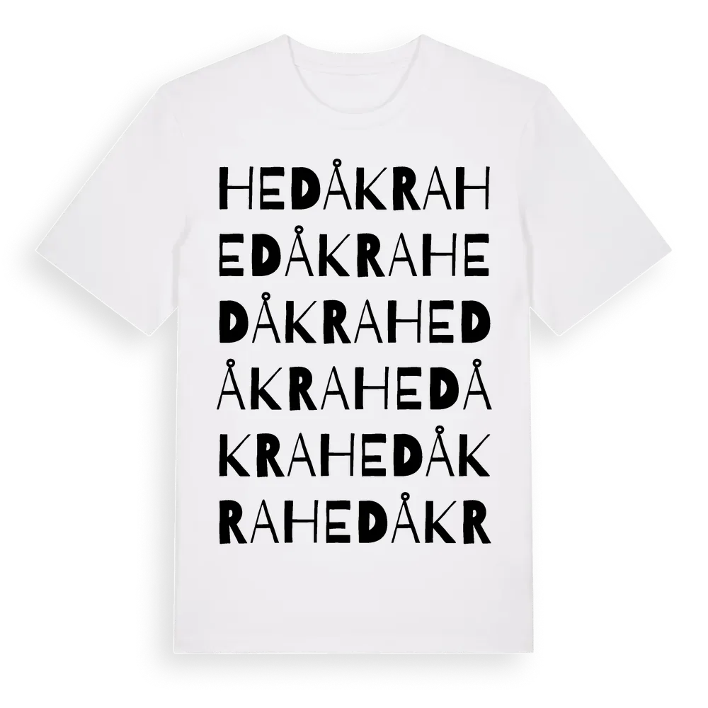 Hedåkra ordlek t-shirt är inspirerad av Hedåkra i Skåne län, Sverige. Tröjan är designad för dig som har en speciell koppling till platsen – oavsett om du bor här, har rötterna här eller bara älskar Hedåkra.