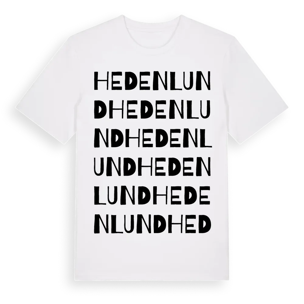 Hedenlund ordlek t-shirt är inspirerad av Hedenlund i Skåne län, Sverige. Tröjan är designad för dig som har en speciell koppling till platsen – oavsett om du bor här, har rötterna här eller bara älskar Hedenlund.