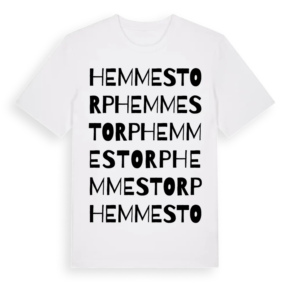 Hemmestorp ordlek t-shirt är inspirerad av byn Hemmestorp i Skåne län, Sverige. Tröjan är designad för dig som har en speciell koppling till platsen – oavsett om du bor här, har rötterna här eller bara älskar Hemmestorp.