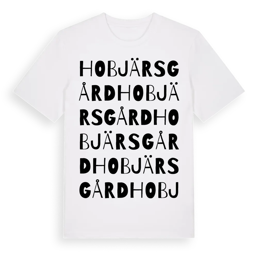 Hobjärs Gård ordlek t-shirt är inspirerad av Hobjärs Gård i Skåne län, Sverige. Tröjan är designad för dig som har en speciell koppling till platsen – oavsett om du bor här, har rötterna här eller bara älskar Hobjärs Gård.
