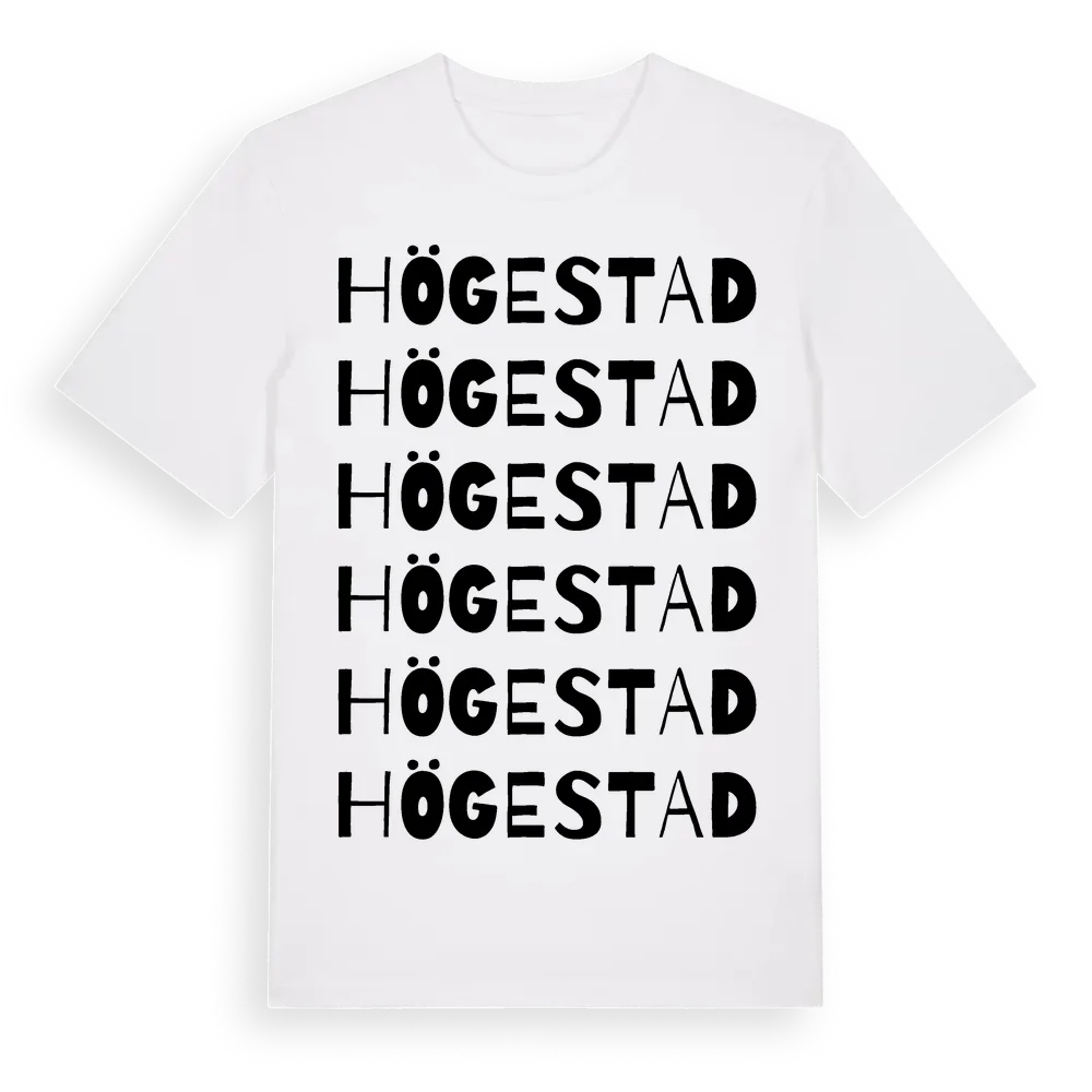 En ordlek byggd på Högestads namn. Subtilt och klurig – ett motiv som bara de som verkligen känner platsen fullt ut förstår. Premium bomull, unisex – från Högestad i Skåne län.
