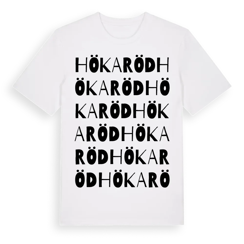 Hökaröd ordlek t-shirt är inspirerad av Hökaröd i Skåne län, Sverige. Tröjan är designad för dig som har en speciell koppling till platsen – oavsett om du bor här, har rötterna här eller bara älskar Hökaröd.