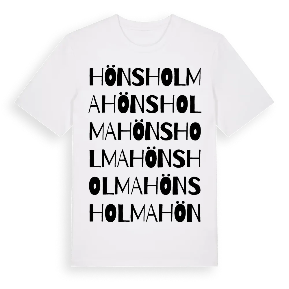 Hönsholma ordlek t-shirt är inspirerad av byn Hönsholma i Skåne län, Sverige. Tröjan är designad för dig som har en speciell koppling till platsen – oavsett om du bor här, har rötterna här eller bara älskar Hönsholma.
