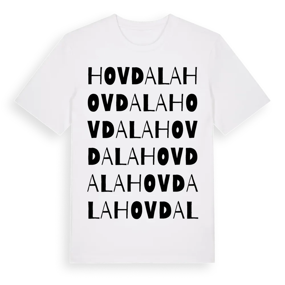 En ordlek byggd på Hovdalas namn. Subtilt och klurig – ett motiv som bara de som verkligen känner platsen fullt ut förstår. Premium bomull, unisex – från stadsdelen Hovdala i Skåne län.