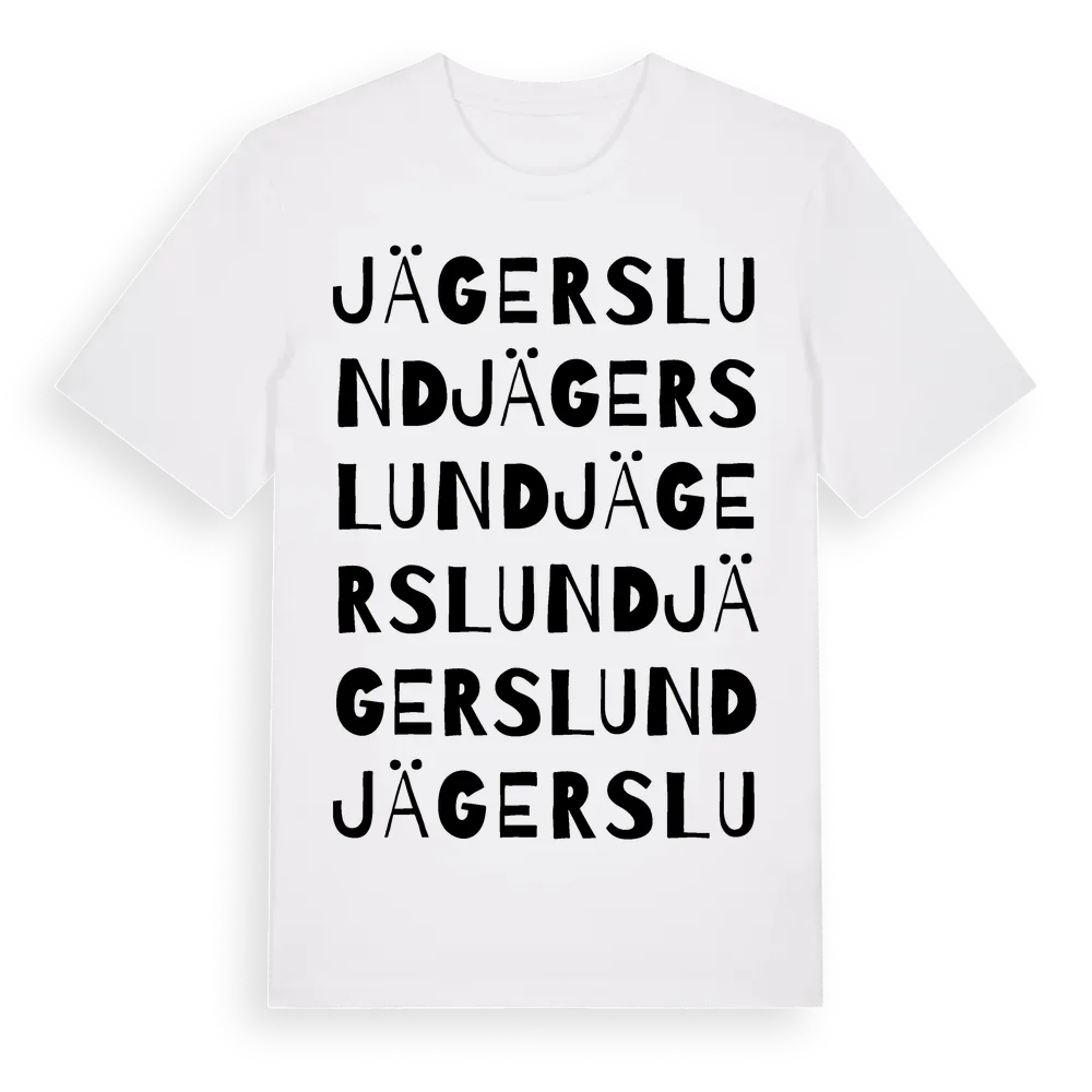 Jägerslund ordlek t-shirt är inspirerad av Jägerslund i Skåne län, Sverige. Tröjan är designad för dig som har en speciell koppling till platsen – oavsett om du bor här, har rötterna här eller bara älskar Jägerslund.