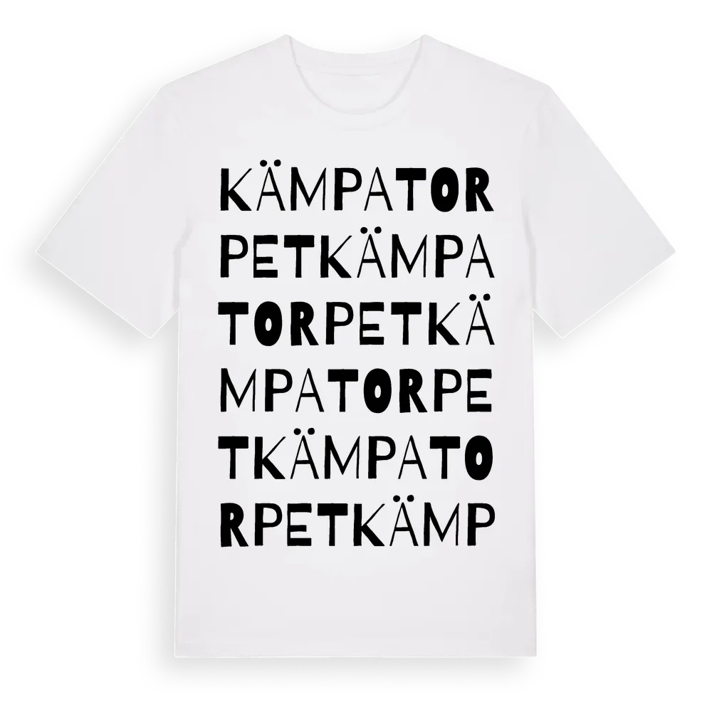 Kämpatorpet ordlek t-shirt är inspirerad av Kämpatorpet i Skåne län, Sverige. Tröjan är designad för dig som har en speciell koppling till platsen – oavsett om du bor här, har rötterna här eller bara älskar Kämpatorpet.