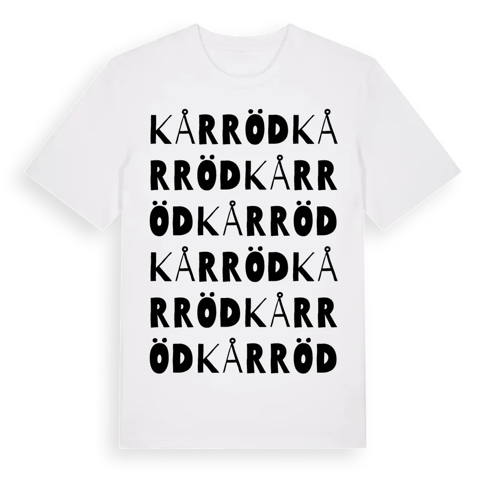 Kårröd ordlek t-shirt är inspirerad av Kårröd i Skåne län, Sverige. Tröjan är designad för dig som har en speciell koppling till platsen – oavsett om du bor här, har rötterna här eller bara älskar Kårröd.