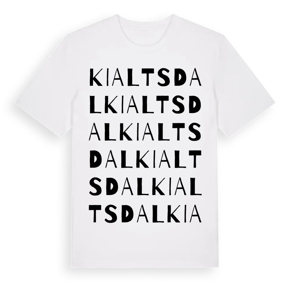 Kialtsdal ordlek t-shirt är inspirerad av Kialtsdal i Skåne län, Sverige. Tröjan är designad för dig som har en speciell koppling till platsen – oavsett om du bor här, har rötterna här eller bara älskar Kialtsdal.