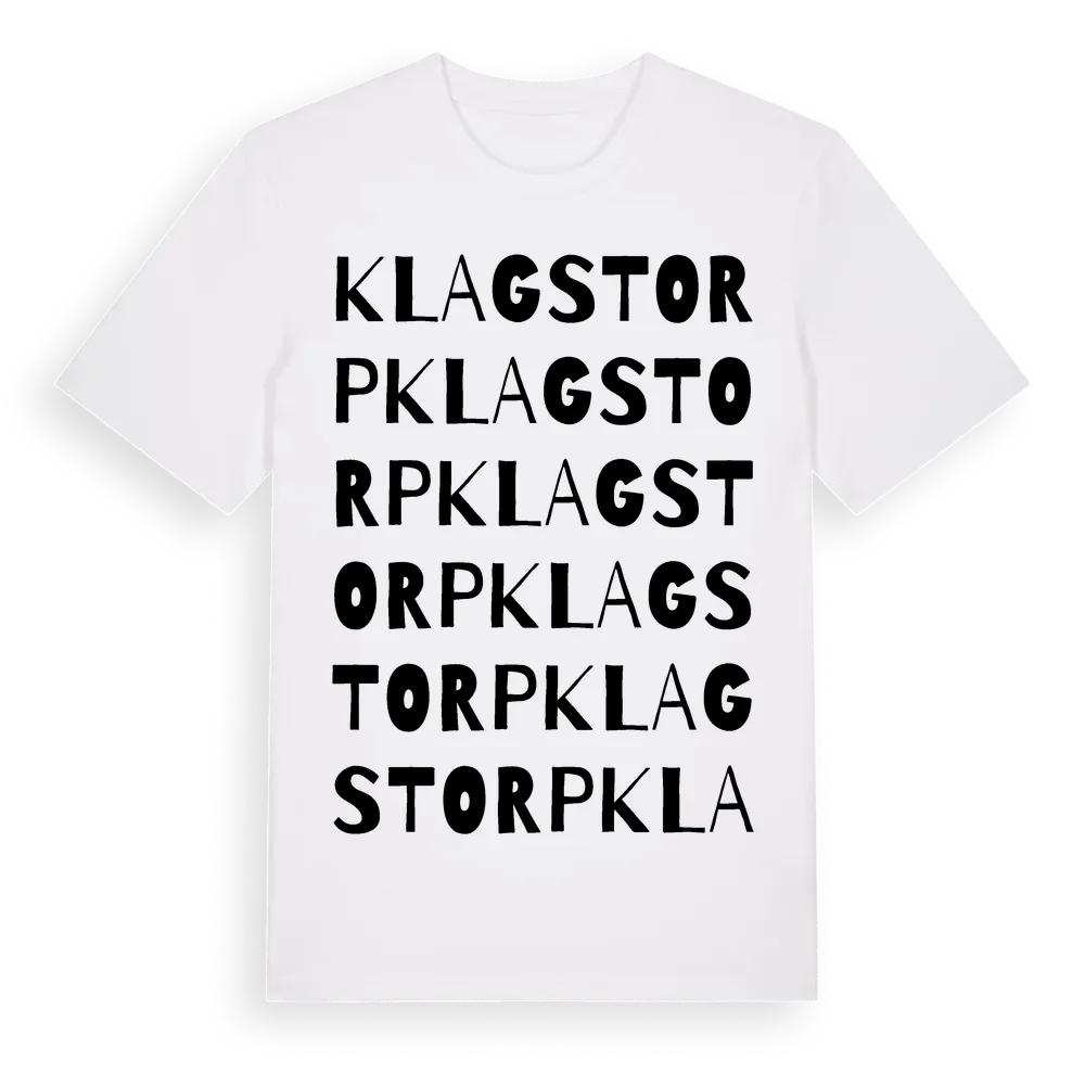 Klagstorp ordlek t-shirt är inspirerad av byn Klagstorp i Skåne län, Sverige. Tröjan är designad för dig som har en speciell koppling till platsen – oavsett om du bor här, har rötterna här eller bara älskar Klagstorp.