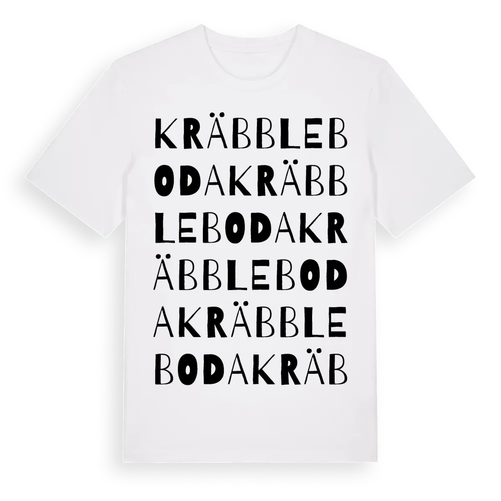 Kräbbleboda ordlek t-shirt är inspirerad av byn Kräbbleboda i Skåne län, Sverige. Tröjan är designad för dig som har en speciell koppling till platsen – oavsett om du bor här, har rötterna här eller bara älskar Kräbbleboda.
