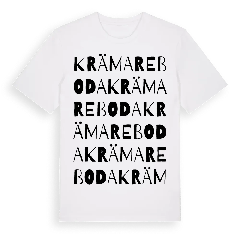 Krämareboda ordlek t-shirt är inspirerad av Krämareboda i Skåne län, Sverige. Tröjan är designad för dig som har en speciell koppling till platsen – oavsett om du bor här, har rötterna här eller bara älskar Krämareboda.