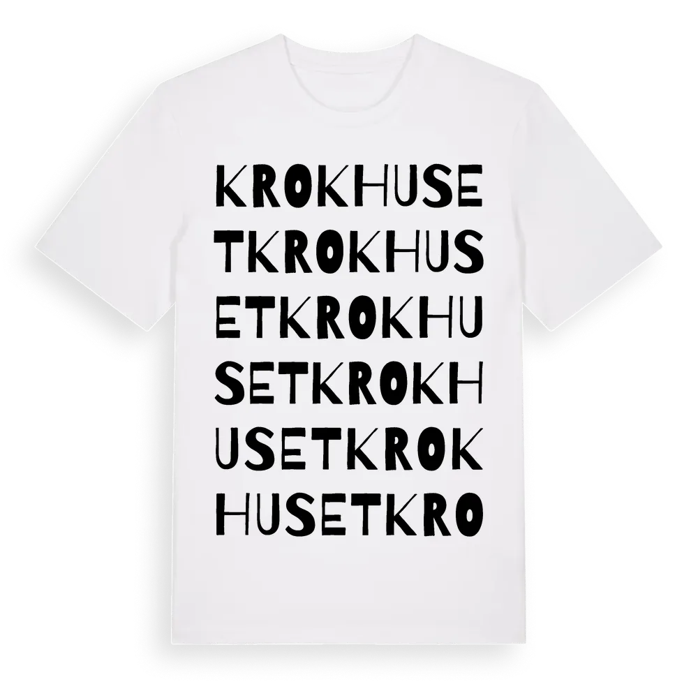 Krokhuset ordlek t-shirt är inspirerad av Krokhuset i Skåne län, Sverige. Tröjan är designad för dig som har en speciell koppling till platsen – oavsett om du bor här, har rötterna här eller bara älskar Krokhuset.
