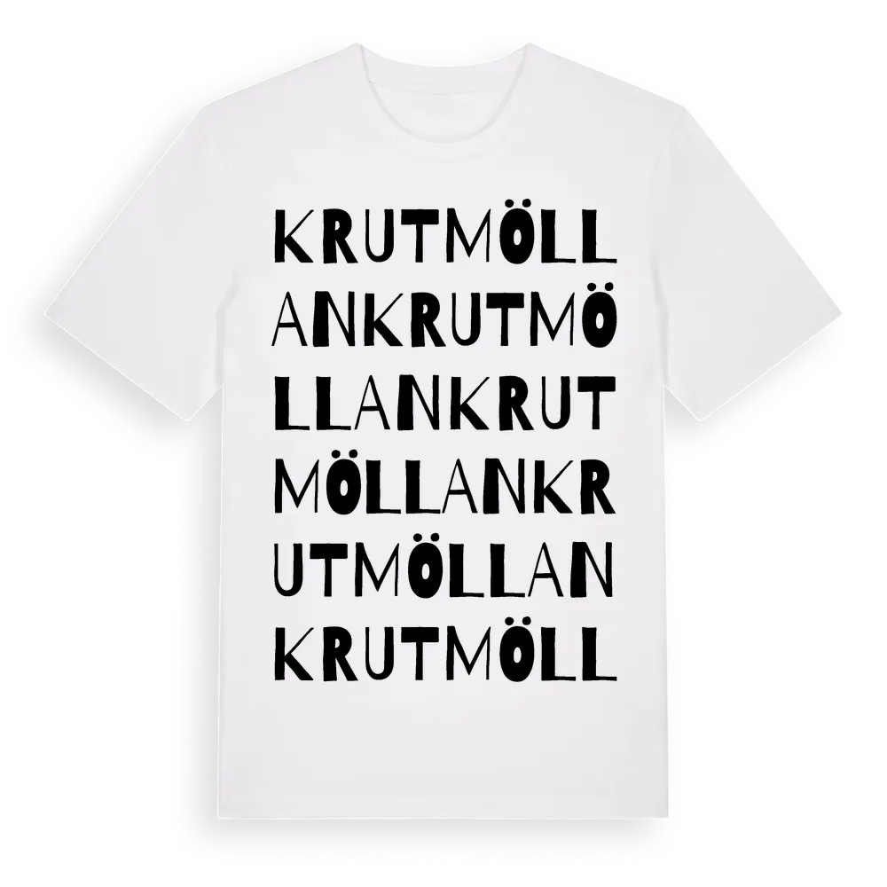 Krutmöllan ordlek t-shirt är inspirerad av byn Krutmöllan i Skåne län, Sverige. Tröjan är designad för dig som har en speciell koppling till platsen – oavsett om du bor här, har rötterna här eller bara älskar Krutmöllan.