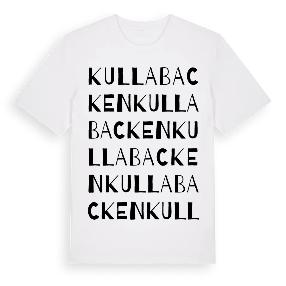 Kullabacken ordlek t-shirt är inspirerad av Kullabacken i Skåne län, Sverige. Tröjan är designad för dig som har en speciell koppling till platsen – oavsett om du bor här, har rötterna här eller bara älskar Kullabacken.