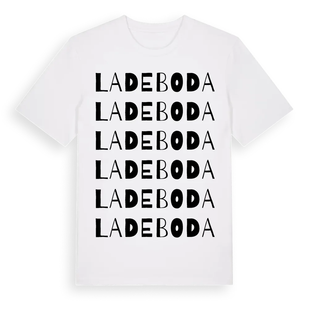 En ordlek byggd på Ladebodas namn. Subtilt och klurig – ett motiv som bara de som verkligen känner platsen fullt ut förstår. Premium bomull, unisex – från Ladeboda i Skåne län.