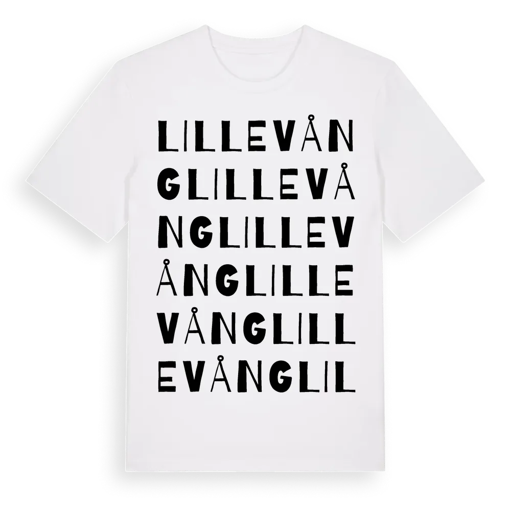 Lillevång ordlek t-shirt är inspirerad av byn Lillevång i Skåne län, Sverige. Tröjan är designad för dig som har en speciell koppling till platsen – oavsett om du bor här, har rötterna här eller bara älskar Lillevång.
