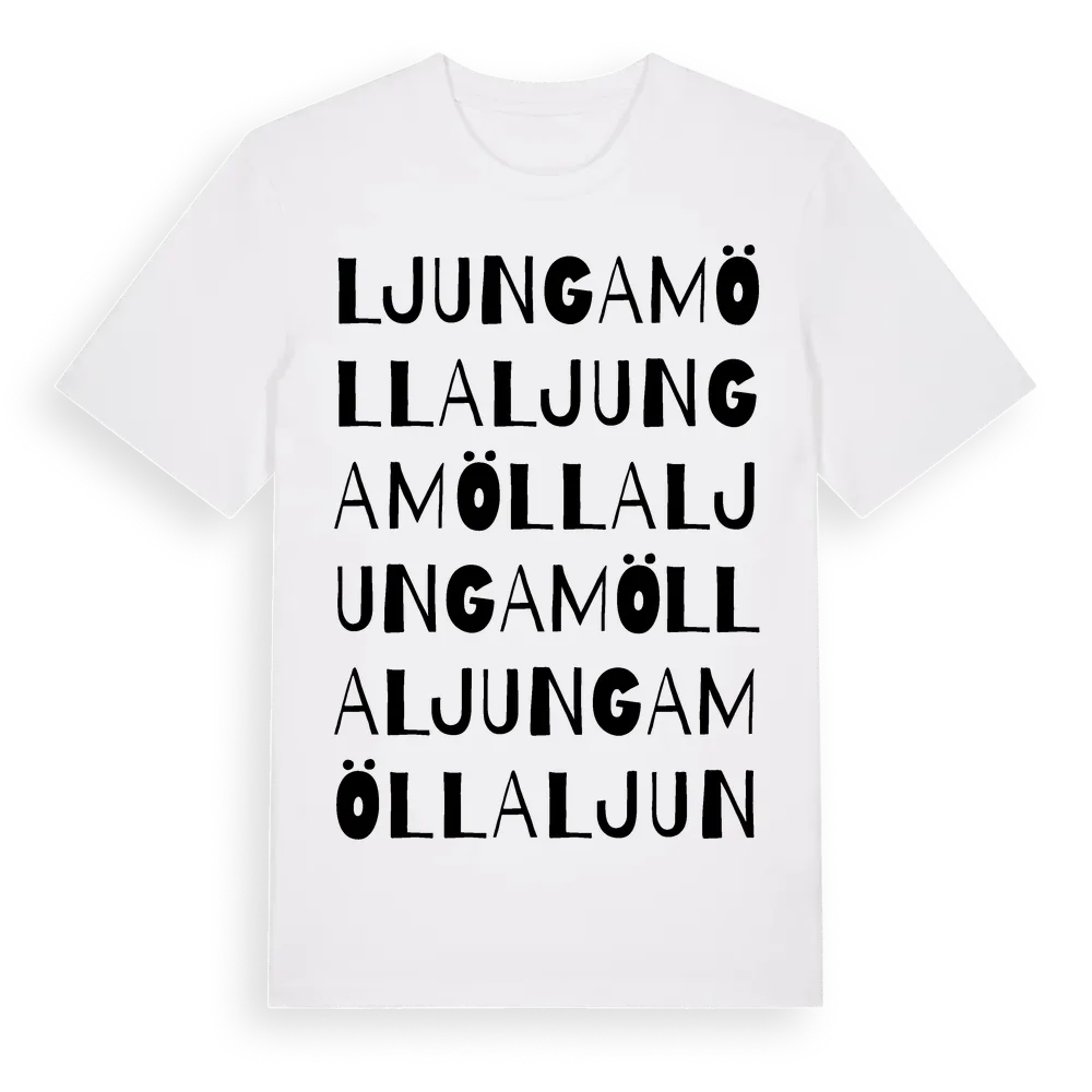 Ljungamölla ordlek t-shirt är inspirerad av byn Ljungamölla i Skåne län, Sverige. Tröjan är designad för dig som har en speciell koppling till platsen – oavsett om du bor här, har rötterna här eller bara älskar Ljungamölla.