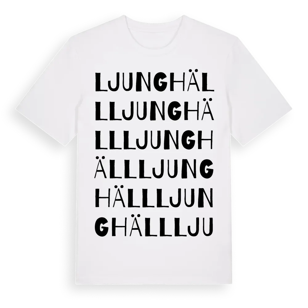 Ljunghäll ordlek t-shirt är inspirerad av Ljunghäll i Skåne län, Sverige. Tröjan är designad för dig som har en speciell koppling till platsen – oavsett om du bor här, har rötterna här eller bara älskar Ljunghäll.