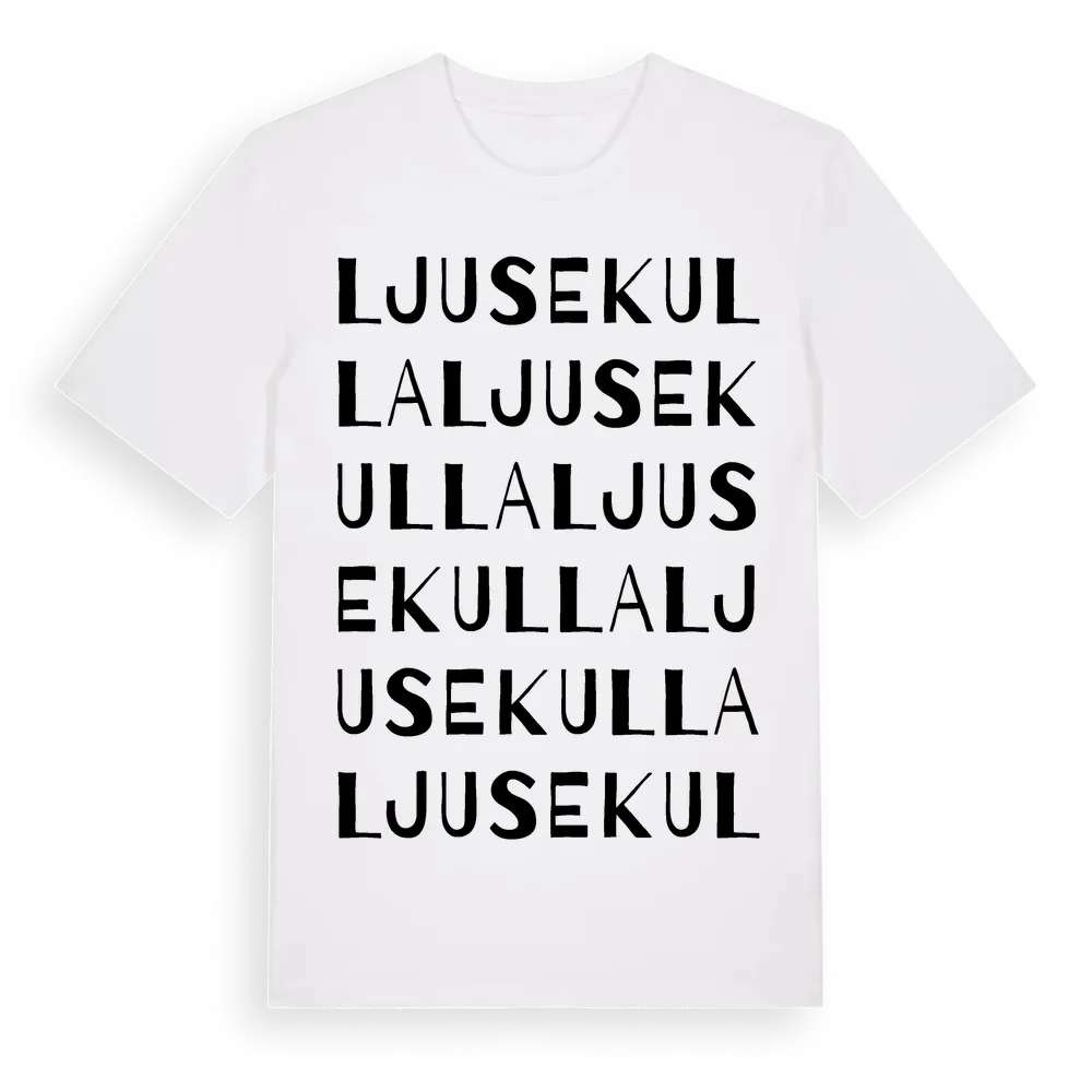 Ljusekulla ordlek t-shirt är inspirerad av Ljusekulla i Skåne län, Sverige. Tröjan är designad för dig som har en speciell koppling till platsen – oavsett om du bor här, har rötterna här eller bara älskar Ljusekulla.