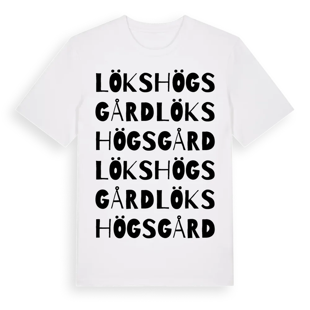Lökshögs Gård ordlek t-shirt är inspirerad av Lökshögs Gård i Skåne län, Sverige. Tröjan är designad för dig som har en speciell koppling till platsen – oavsett om du bor här, har rötterna här eller bara älskar Lökshögs Gård.