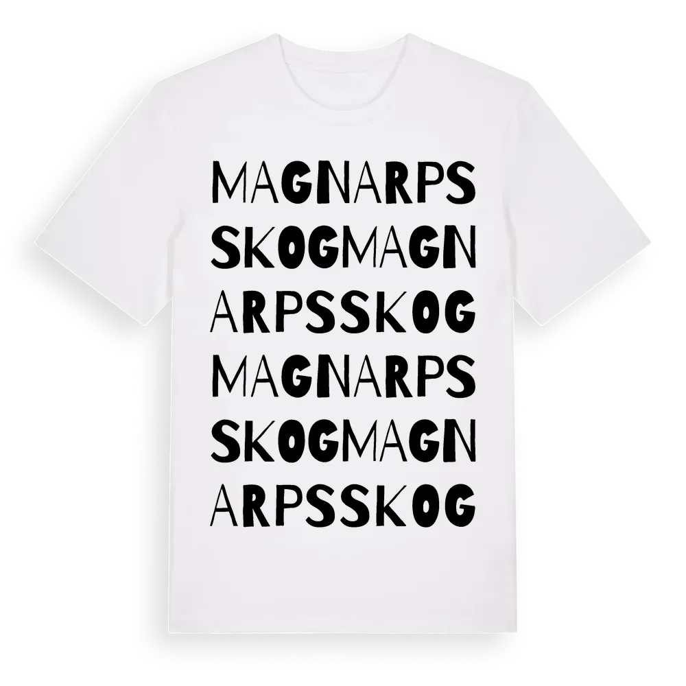 Magnarps Skog ordlek t-shirt är inspirerad av Magnarps Skog i Skåne län, Sverige. Tröjan är designad för dig som har en speciell koppling till platsen – oavsett om du bor här, har rötterna här eller bara älskar Magnarps Skog.