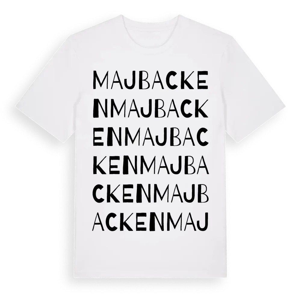 Majbacken ordlek t-shirt är inspirerad av Majbacken i Skåne län, Sverige. Tröjan är designad för dig som har en speciell koppling till platsen – oavsett om du bor här, har rötterna här eller bara älskar Majbacken.