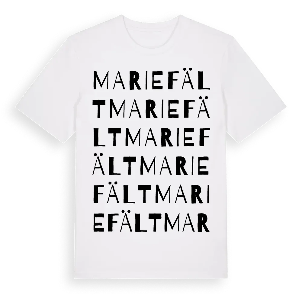 Mariefält ordlek t-shirt är inspirerad av Mariefält i Skåne län, Sverige. Tröjan är designad för dig som har en speciell koppling till platsen – oavsett om du bor här, har rötterna här eller bara älskar Mariefält.