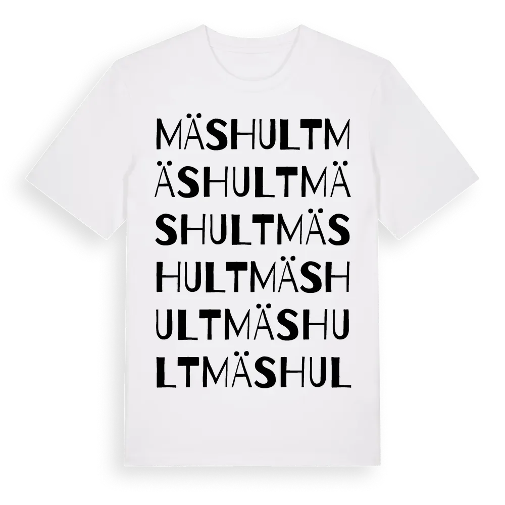 Mäshult ordlek t-shirt är inspirerad av byn Mäshult i Skåne län, Sverige. Tröjan är designad för dig som har en speciell koppling till platsen – oavsett om du bor här, har rötterna här eller bara älskar Mäshult.